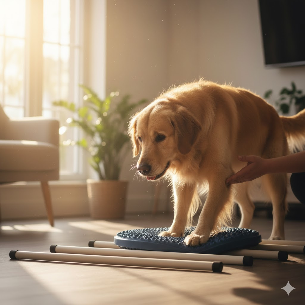 Aktive Bewegung & Koordination: Wir führen gezielte Übungen durch, um die Tiefenmuskulatur und das Gleichgewicht deines Hundes zu schulen (z.B. durch Cavaletti-Training oder Balance-Pads).